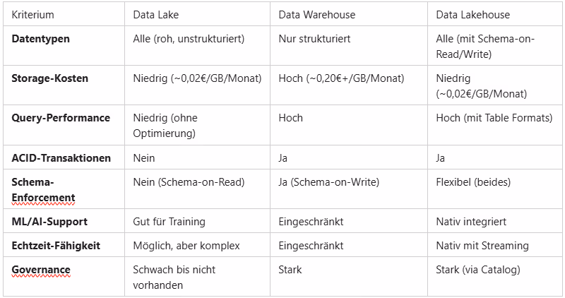 ...wenn du primär Rohdaten für spätere, noch unbekannte Analysen archivieren willst und keine sofortigen Governance-Anforderungen hast. In der Praxis ist das selten der Fall. Die meisten „reinen" Data Lakes werden früher oder später zum Lakehouse migriert, weil die fehlende Governance zum Showstopper wird.