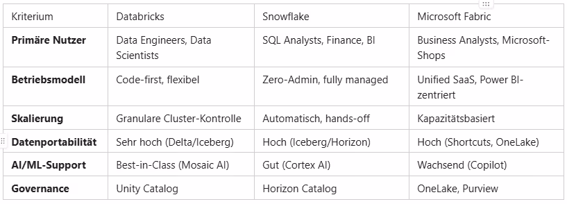 Databricks, Snowflake und Microsoft Fabric bieten alle Lakehouse-Fähigkeiten. Worin sie sich unterscheiden: Herkunft, Architekturphilosophie und Stärken bei spezifischen Workloads.