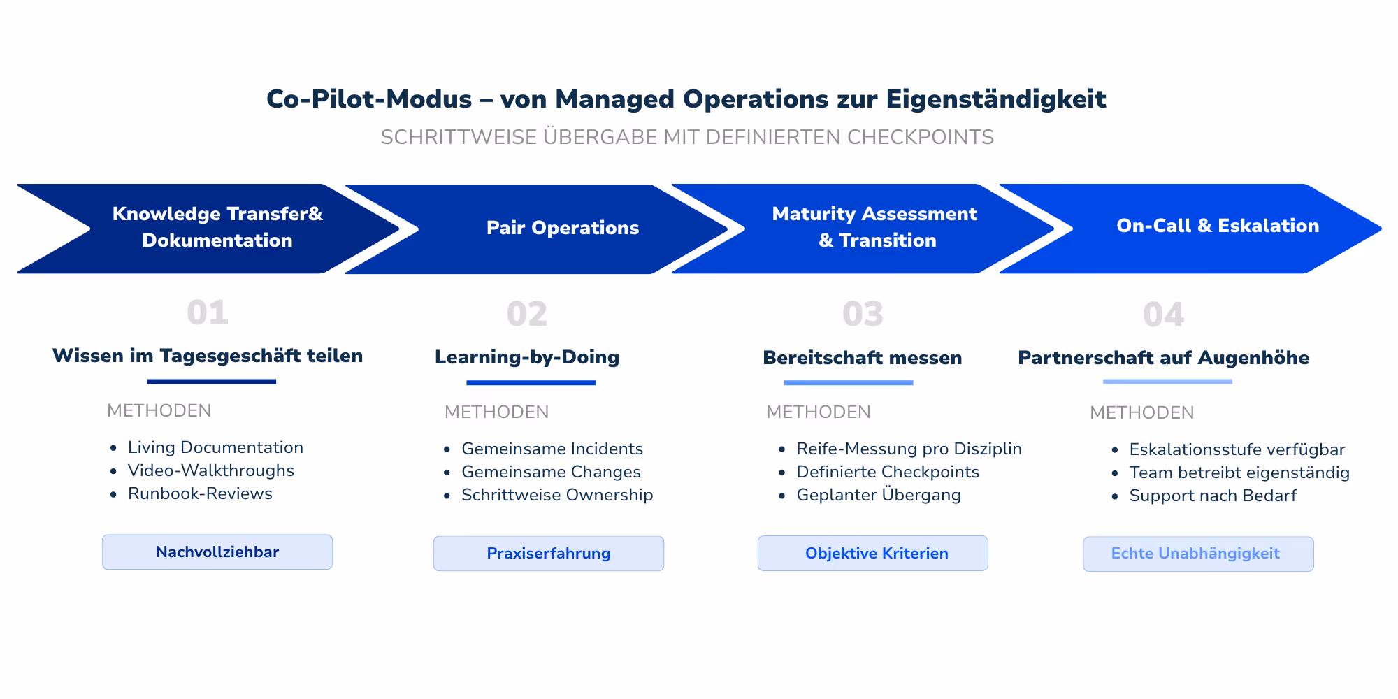 Wir arbeiten im Co-Pilot-Modus: Wir übernehmen den Betrieb, solange euer Team noch nicht bereit ist und übergeben schrittweise.