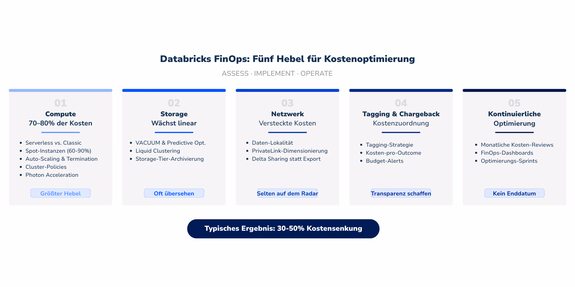 Storage-Kosten sind typischerweise kleiner als Compute, aber sie wachsen linear mit dem Datenvolumen; und unkontrolliert, wenn niemand aufräumt. Wir sehen regelmäßig Umgebungen, in denen über die Hälfte des Storage-Volumens aus veralteten Dateiversionen besteht. Dazu kommt: Das physische Datenlayout bestimmt die Query-Performance und damit indirekt die Compute-Kosten. Falsch organisierte Daten führen zu Full-Table-Scans, wo gezielte Zugriffe möglich wären.
