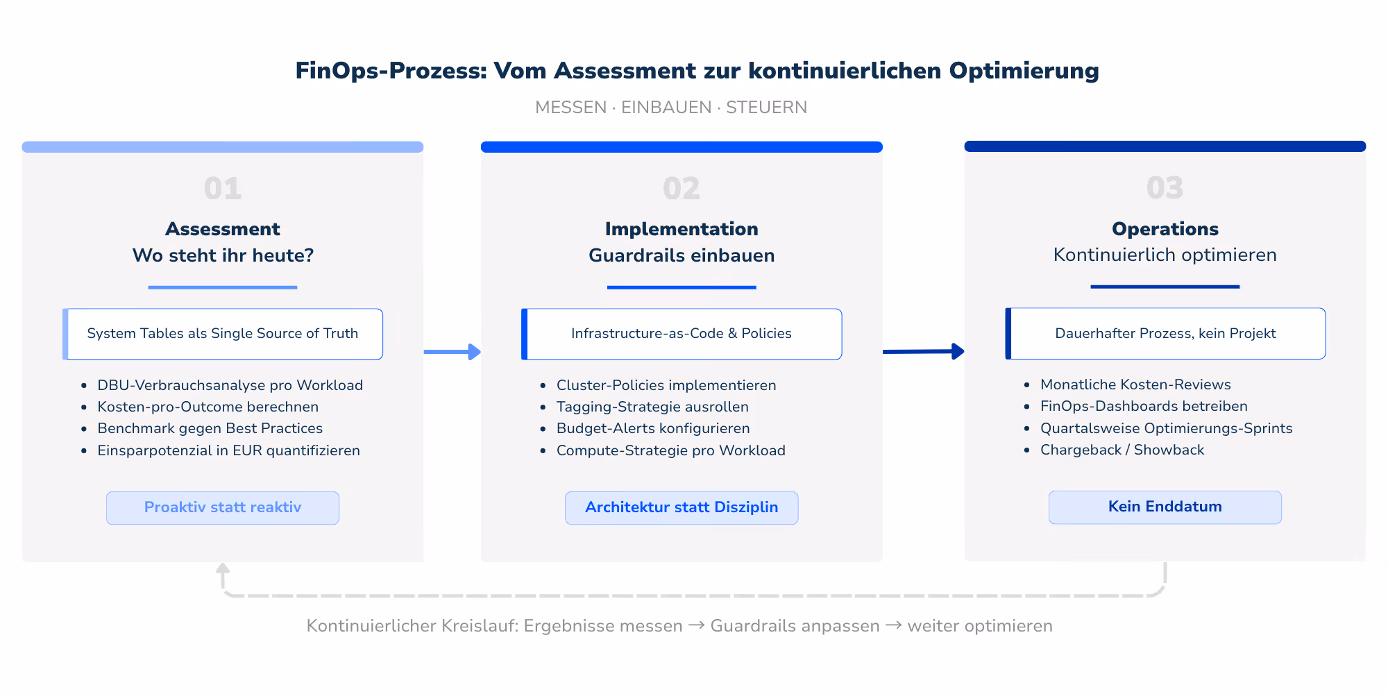 Die Compute-Kosten machen 70-80% der Gesamtkosten von Databricks aus. Das größte Potenzial zur Optimierung liegt nicht in der Cluster-Größe, sondern in der Compute-Strategie. Über ein Dutzend Compute-Optionen stellt Databricks bereit; und die meisten Teams wählen nicht die richtige Kombination. Es liegt nicht an Unwissenheit, sondern daran, dass die beste Strategie von Workload-Profil, Latenzanforderungen und Fehlertoleranz abhängt. Wir untersuchen euren spezifischen Workload-Mix und setzen die Compute-Strategie um, die für euer Profil die geringsten Kosten bei akzeptabler Performance bietet.