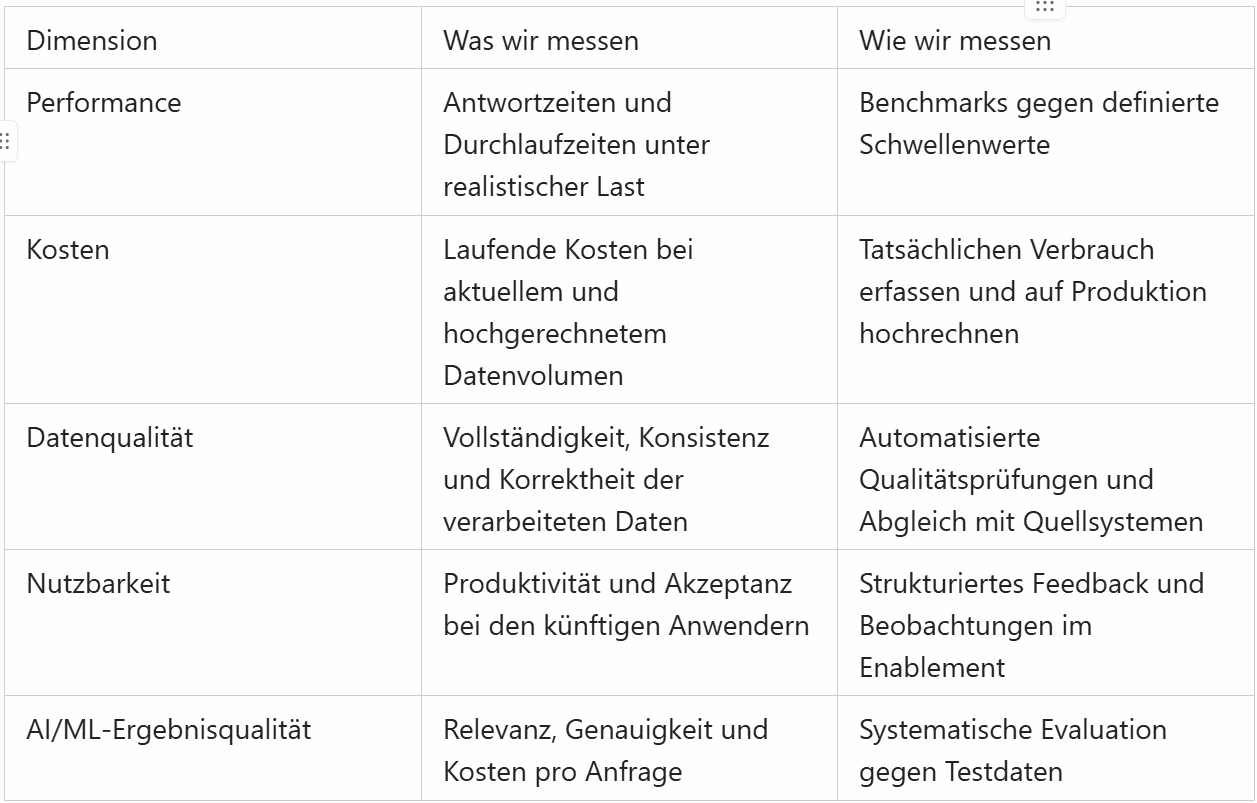 Wir formulieren eine messbare Hypothese, definieren die Erfolgskriterien vor dem Start und skizzieren eine produktionsnahe Zielarchitektur; genug Struktur für belastbare Ergebnisse, ohne Voll-Implementation.