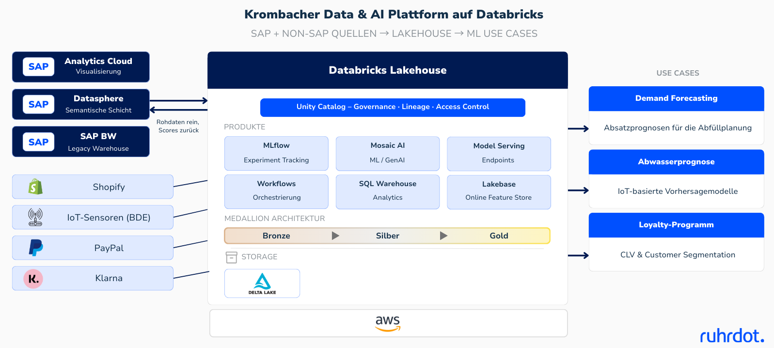 In rund zwölf Monaten entstand bei Krombacher eine einheitliche Data-&-AI-Workbench auf Databricks. Daten aus SAP Datasphere, SAP BW, Shopify, IoT-Sensoren der Betriebsdatenerfassung sowie PayPal, Klarna und weiteren Quellen laufen heute in einer zentralen Lakehouse-Architektur zusammen. Rohdaten werden in Databricks verarbeitet, Prognosen und Scores fließen zurück in die SAP-Welt. So können Fachabteilungen ML-Ergebnisse nutzen, ohne ihre gewohnte SAP-Umgebung zu verlassen.